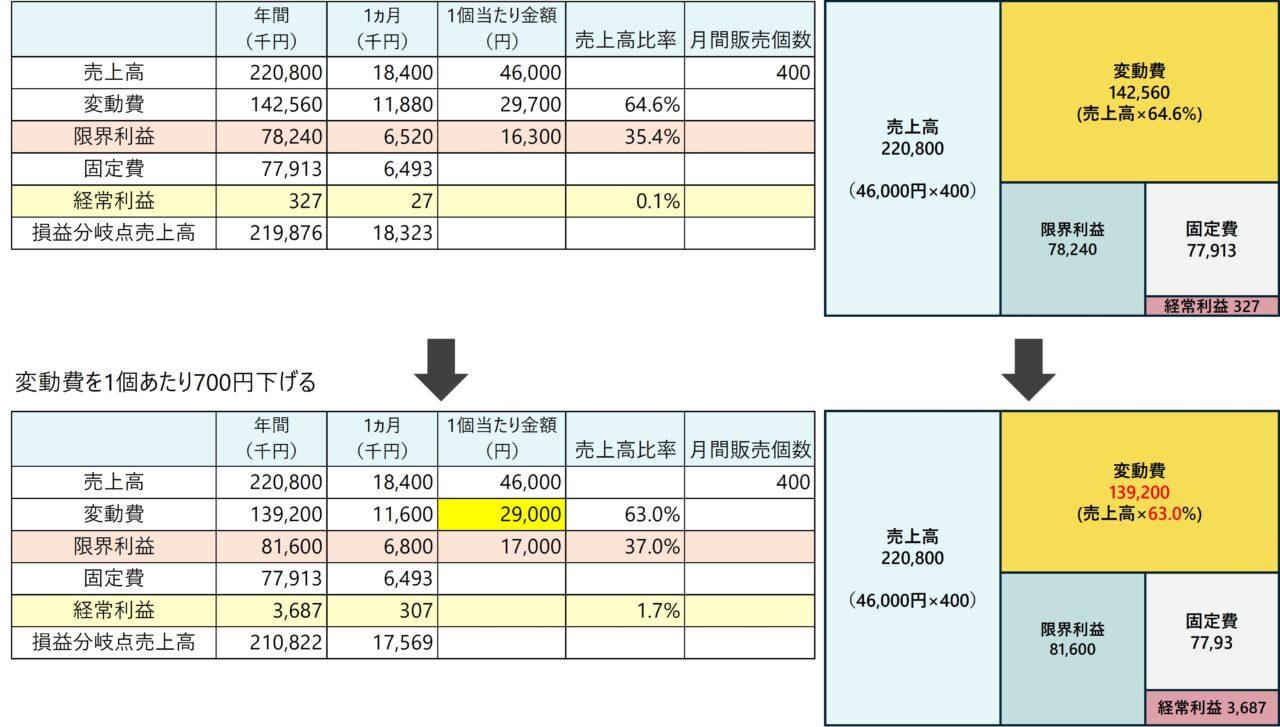 では1個あたりの変動費を700円減らしてみましょう。