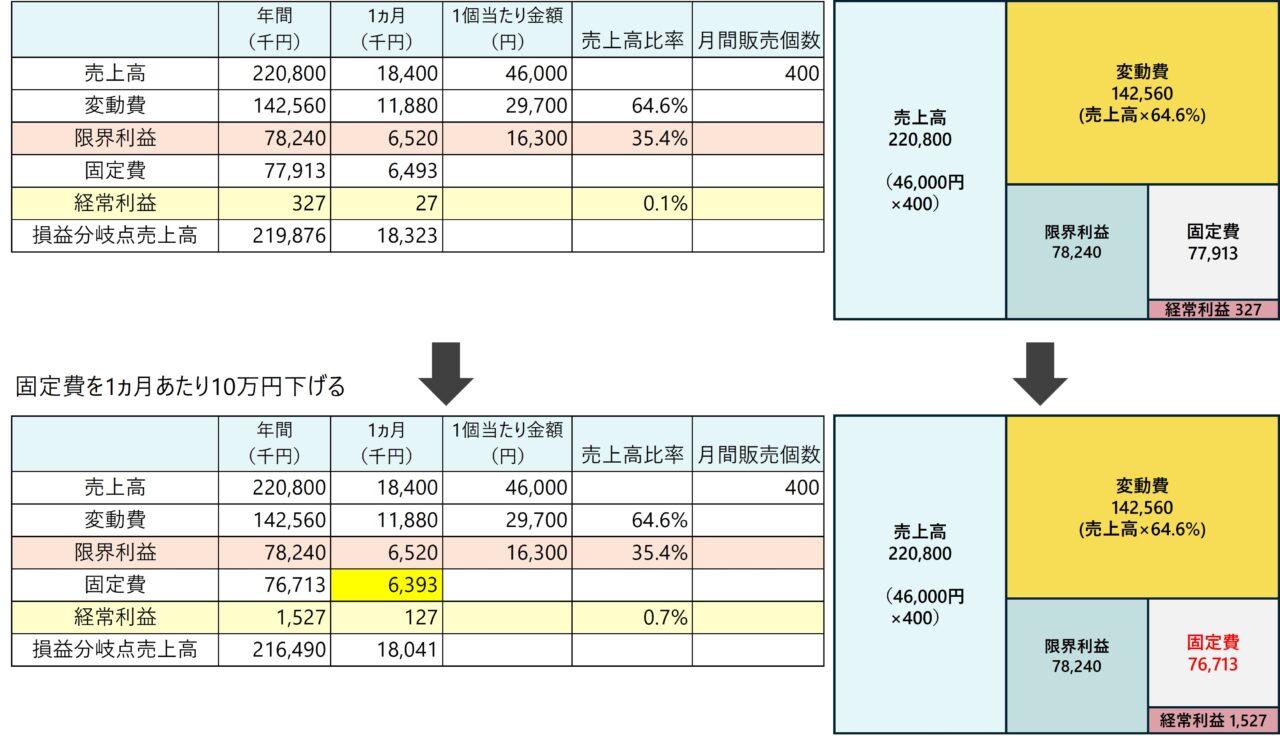 では、どれくらい固定費を下げたらどれだけ利益がでるかシミュレーションをしてみましょう