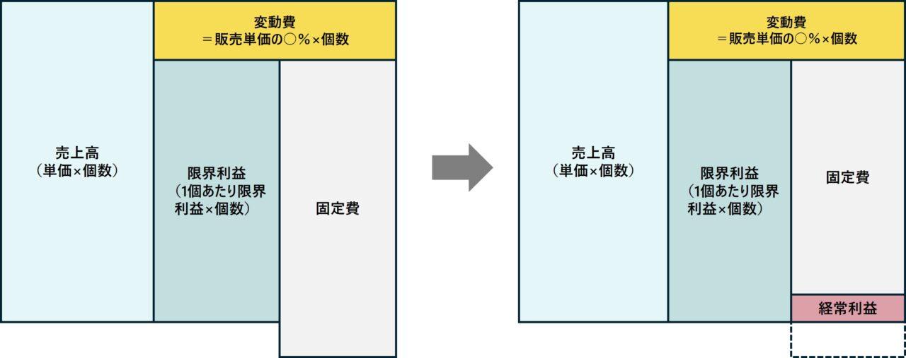 例えば、1万円の商品の変動費が5千円だと、限界利益は5千円、変動費が7千円だと3千円なので、単価あたり、どれくらいの割合が変動費かによって、限界利益の金額が変わりますよね。